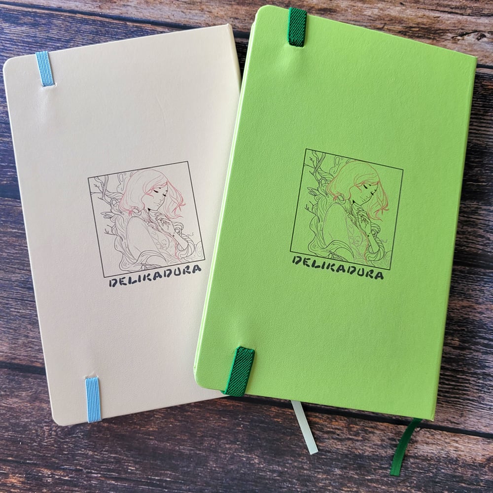 Pleather cover (wear-resistent and waterproof). Pocket at the back. Bandage and ribbon.