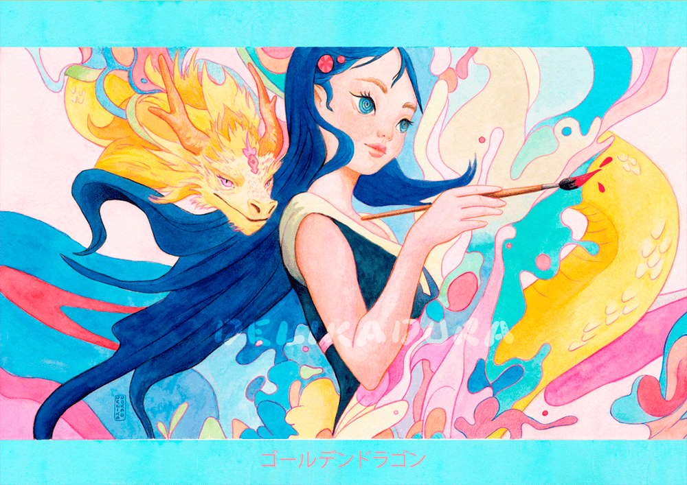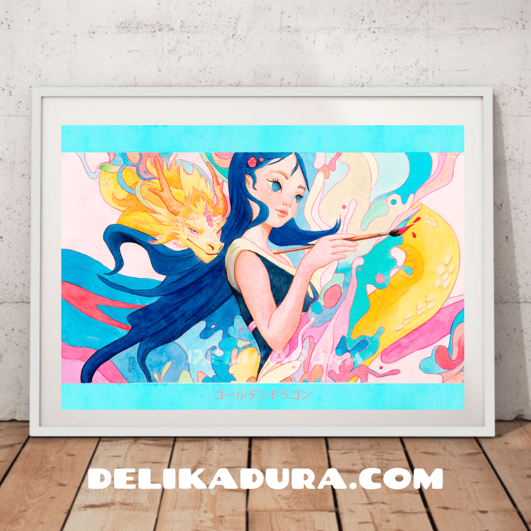 This creature is a conduit for magic and transformation, and this painting is an invitation to embrace our inner power, surrender to the hypnotic pull of creativity, and let our imaginations soar on the wings of the golden dragon.