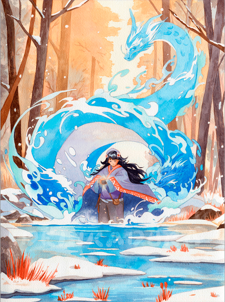 This painting captures a moment suspended in time, a mystical dance between a person and the energy of the water. As she connects with her inner self, the Dragon—a shimmering embodiment of the untamed power of water—coils in silent reverence to the sorceress who summoned it forth. The atmosphere crackles with a blend of tension and serenity, a symphony of elements converging in a visual crescendo.