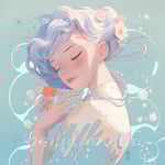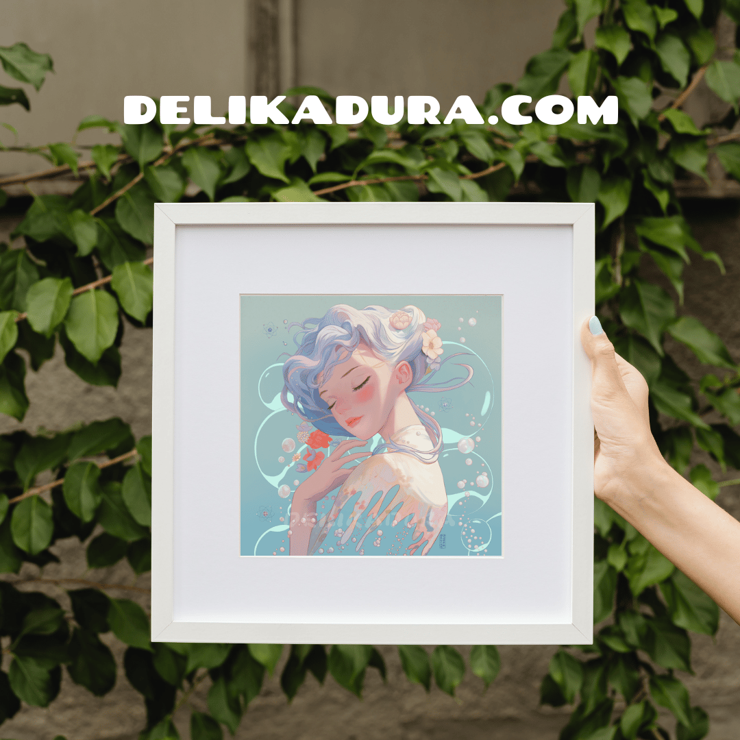 The woman at the center of the composition is the embodiment of the cosmos itself, composed of particles of varying sizes that swirl like iridescent bubbles in the air.