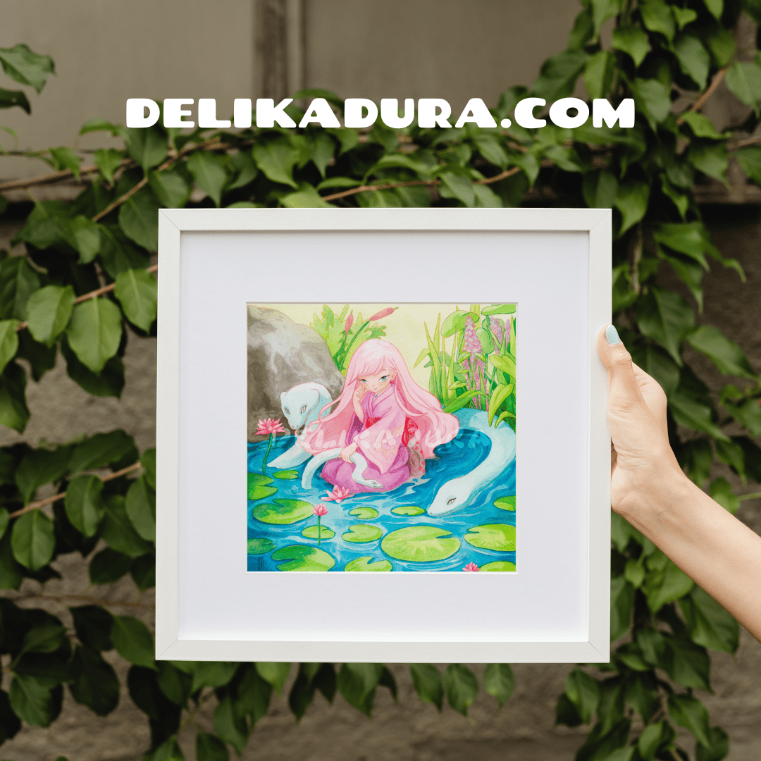 Snake Charmer is a watercolor lullaby, inviting the viewer to surrender to the softness, to the strange harmony of beauty and the wild. It's a celebration of misunderstood creatures, of stillness with power beneath it, and of a girl who’s not afraid to meet your gaze with the quiet strength of someone who sees the world a little differently.